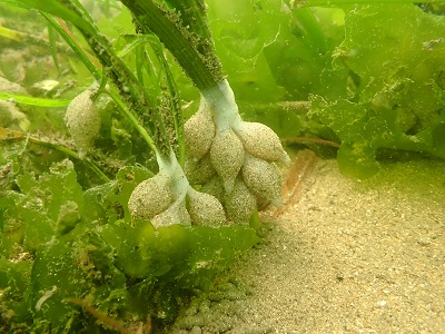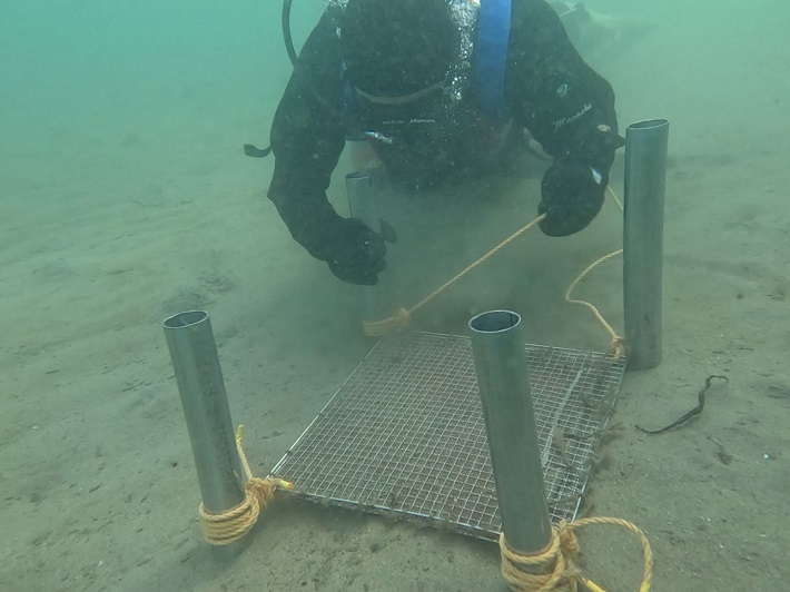 - 活動当初のモニタリング調査では、調査海域内でアマモの生育はほとんど確認されなかったが、年々、確認されるアマモ数が微増加傾向にあり、令和6年6月に実施した潜水調査では、アマモが密集して生育している地点が複数確認され、花枝にはイカの卵の着生が確認された。