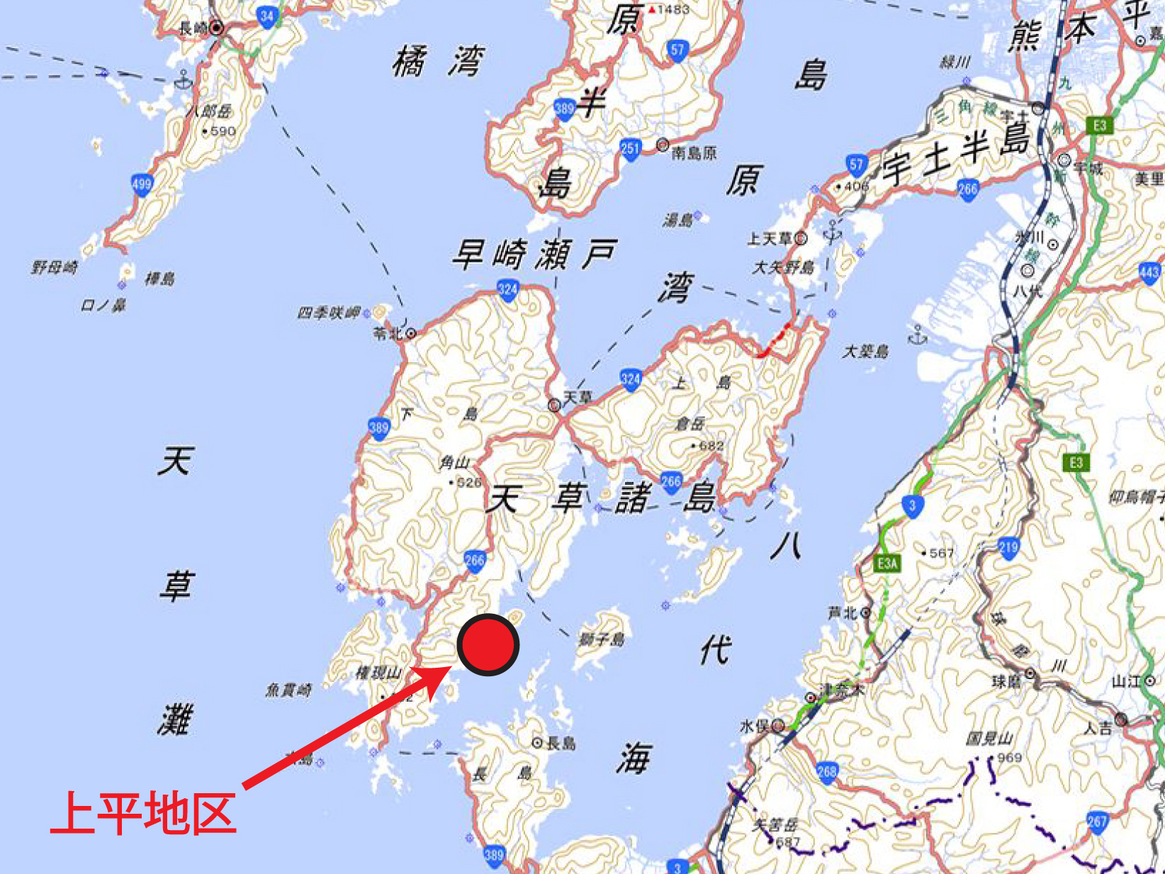 - 上平地区は天草諸島下島の南東部に位置しており、八代海に面している。