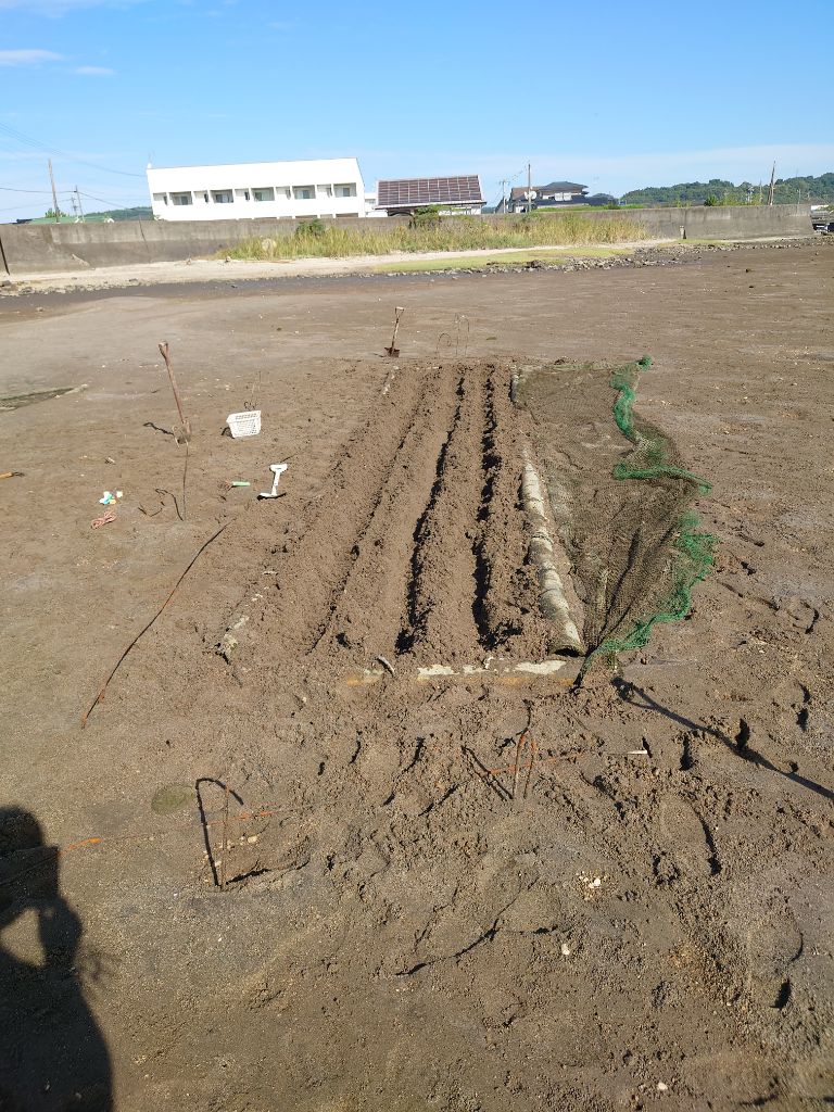 ※現在、保護区域ではケアシェルを入れた袋網に貝を入れ、モニタリングを行っている。以前は花壇式収容施設(周囲を孟宗竹で囲い、食害防止ネットを被せた1.5m×10mの区域の呼称。この施設(区域)をモニタリングの定点としている。)を保護区域としてモニタリングをしていたが、R7.8月豪雨の影響により全ての施設が埋没し、復旧不可能な状態となってしまった。