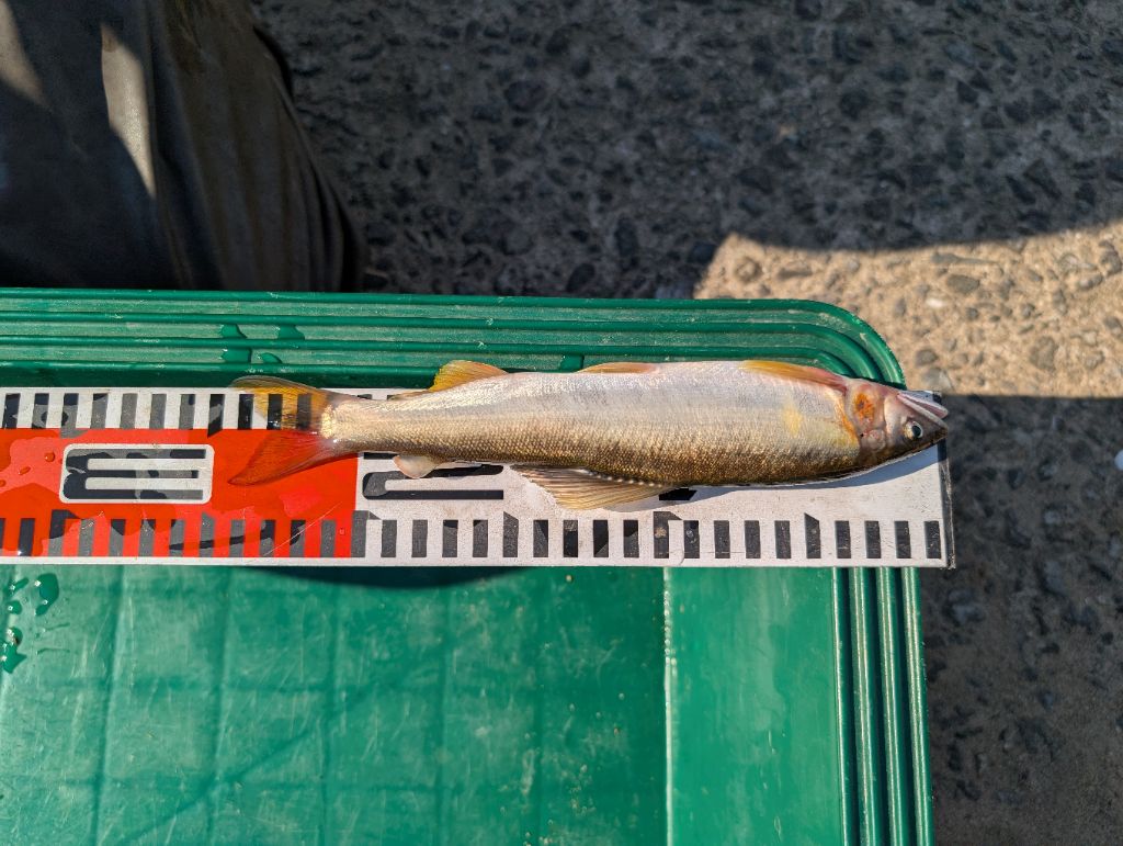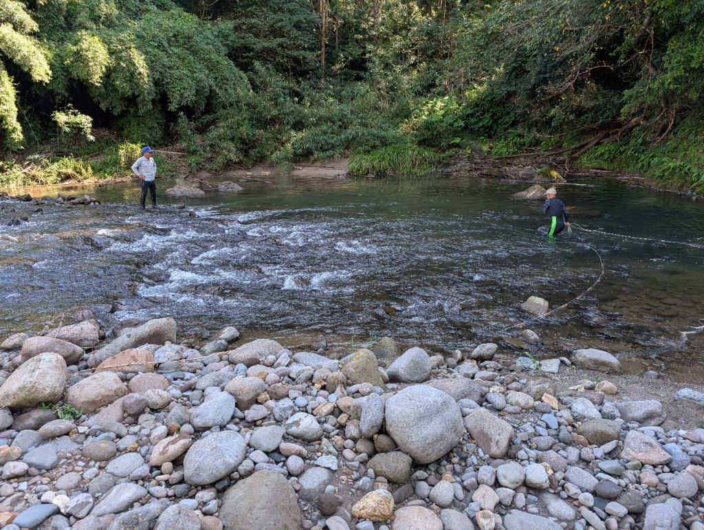 初めての試みるモニタリングの手法であったため県・市の担当者同席のもと11月中旬にモニタリングを実施したが、実施時期が遅く、アユの釣果は得られなかった。この年は春先の稚アユの遡上も極端に少ない年であったこともあり、モニタリング当日は産卵した跡を見つけることもできなかった。